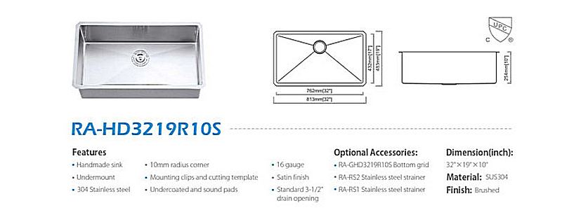 Single Handmade Sink 16G 32″x19″x10″ R10mm