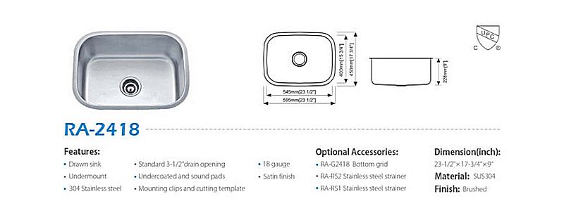 Single Undermount Sink 18G 24″ x 18″ x 9″